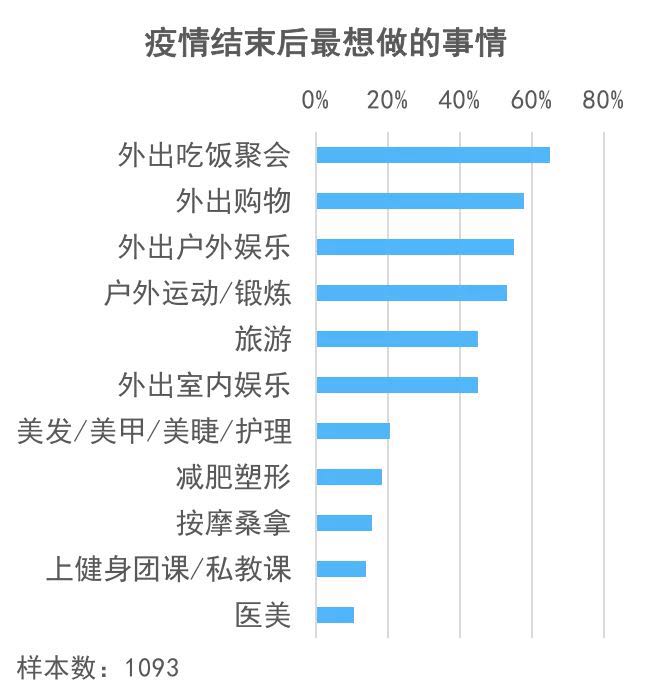 首先,大家都很想出~去~!“疫情结束后最想做的事”里,排名第一的是(不好意思,我们忘记放“喝奶茶”这个选项了~)“外出吃饭聚会”(65%),其次是“外出购物”(58%),然后是“外出户外娱乐”和“户外运动/锻炼”。旅游的提及率也非常高,达45%