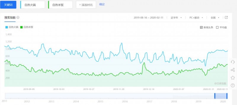 从百度指数显示情况来看,自热火锅一改之前周末上涨,工作日下降的热度规律。自1月24日起,自热火锅和自热米饭搜索指数保持高位。资本市场对方便食品的信心也随之见长。从2月初,三全食品、颐海国际等食品公司的股价就在回升。