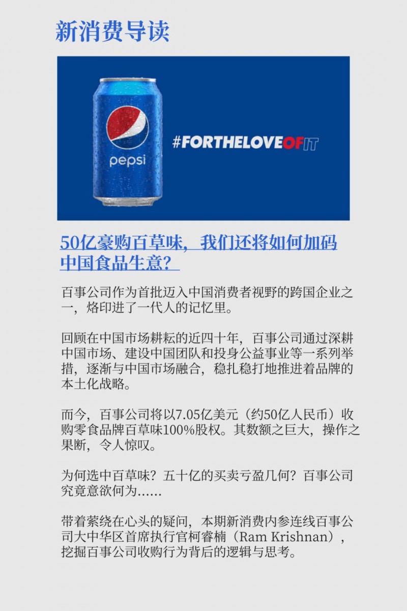 从1981年在深圳设立第一家灌装厂开始,到1993年乐事薯片食品业务引入国内,再到不久前投资五谷磨房,以及今时今日收购百草味......百事公司始终在拉近与中国消费者的距离,更“中国风”,更“接地气”。