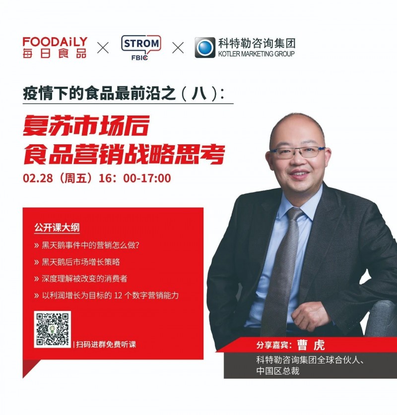 今天的直播课,我们邀请了科特勒咨询集团全球合伙人、中国区总裁曹虎先生,针对黑天鹅事件后的市场变化,为我们分享食品营销战略思考。欢迎大家关注并分享给更多人,希望抱团战疫,在这次疫情中一起成长!