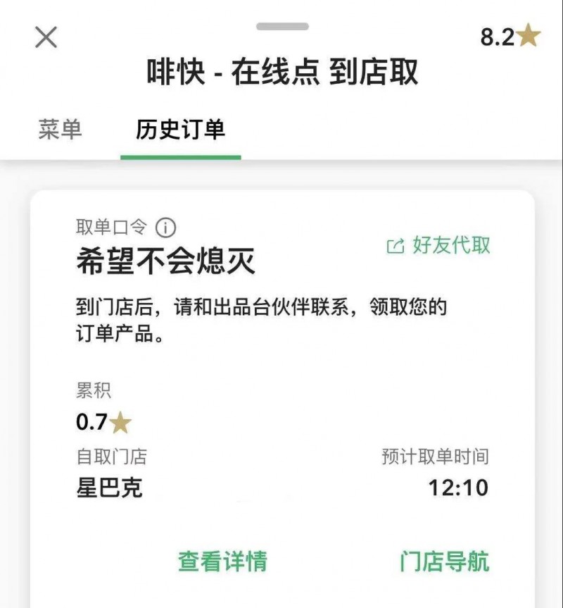 · “啡快Starbucks Now”:“在线点,到店取”,消费者凭取单口令 ,到店无接触取餐