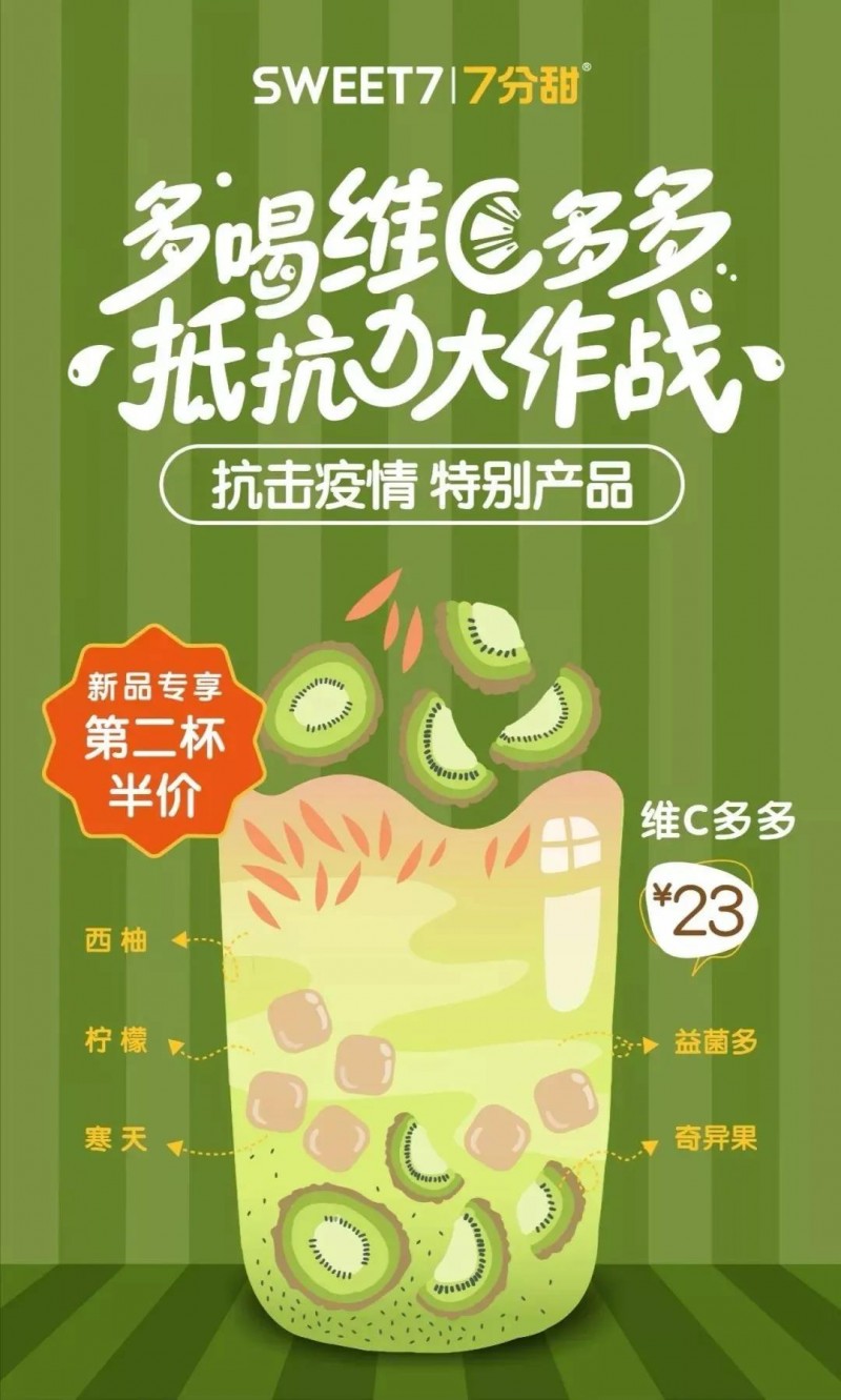 7分甜在复工后不久,就推出了抗击疫情的产品,这款产品主要有西柚、柠檬、奇异果与益生菌,多种水果的组合也就意味着营养更加丰富。