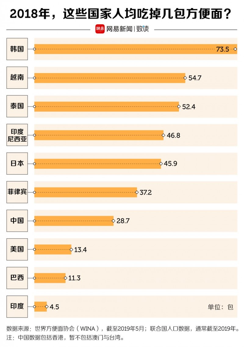 人均来看,每个中国人平均每年会吃近29包方便面,尽管平均数低于同样是方便面“超级粉”的韩国、泰国、越南等国,但依然远高于亚洲之外的许多国家。