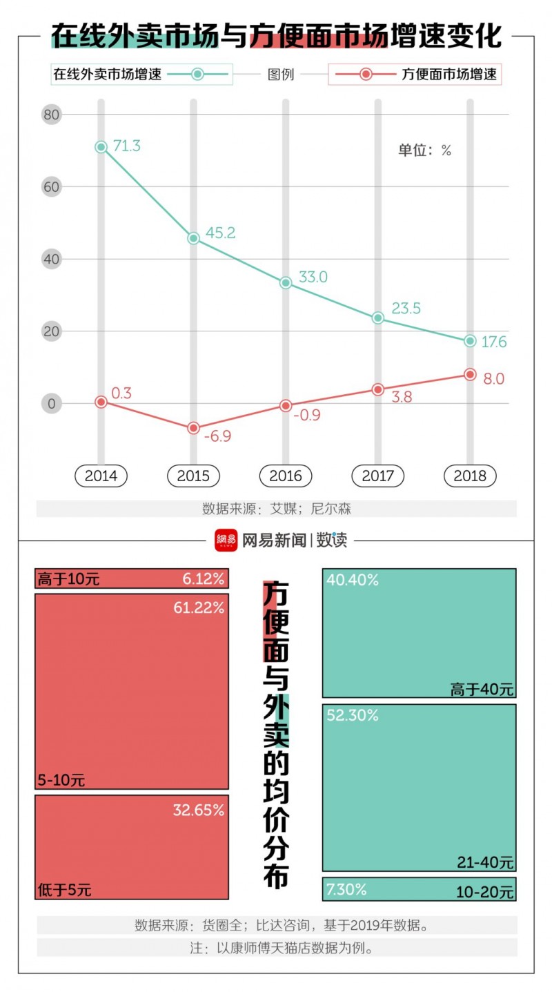 前面已经谈到,2012年后方便面的销售下滑,被认为是在线外卖行业带来的挑战。饿了么、美团外卖等平台早期为了争夺市场,提供了高额补贴,让人们十元甚至五元就可以吃顿不错的饭。