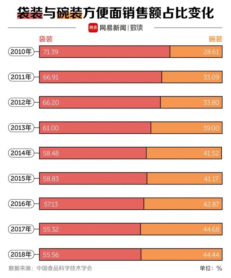 2017年起,方便面在中国的销量出现回暖,并在2018年重新突破400亿包的大关。要知道,以2012年为拐点,方便面在中国的销量已连续下降多年。