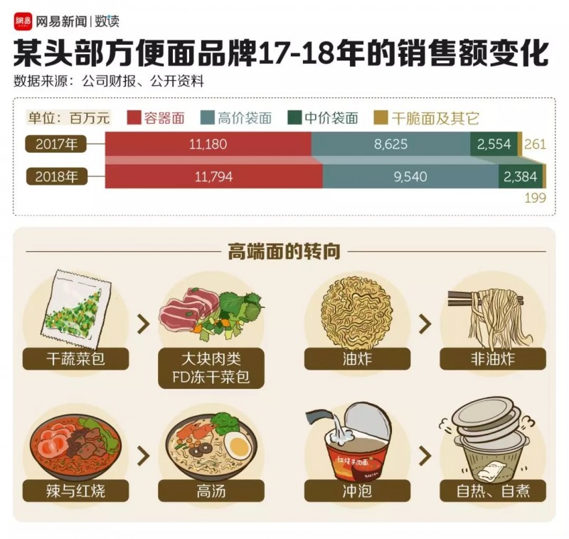 此外,从油炸到非油炸的面饼,从传统的辣与红烧的口味到浓郁高汤、从原本的冲泡尝试升级为自热或者自煮,无一不在体现制造商升级方便面的雄心。