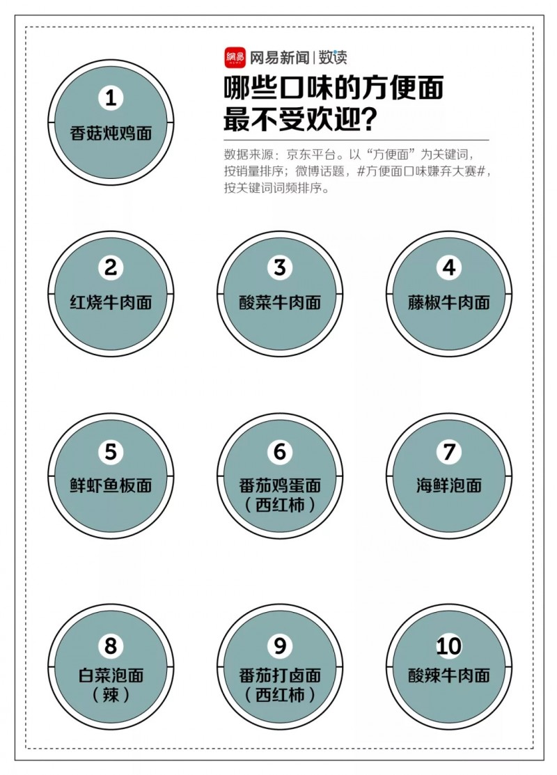 反观人们不太喜欢的口味,香菇炖鸡面名列第一。似乎佐证了疫情期间流传的一张网图:大家都在哄抢的超市里,只有香菇炖鸡面留下了,大家觉得它实在是太惨了。很多网友表示,不喜欢它“怪异”的香菇味和清淡的汤料味。