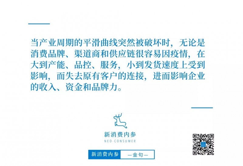 当产业周期的平滑曲线突然被破坏时,无论是消费品牌、渠道商和供应链很容易因疫情,在大到产能、品控、服务,小到发货速度上受到影响,而失去原有客户的连接,进而影响企业的收入、资金和品牌力。