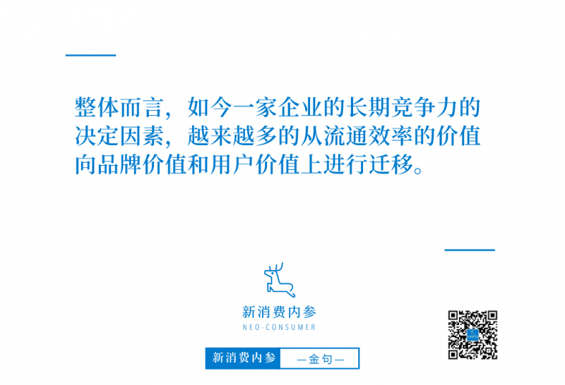 整体而言,如今一家企业的长期竞争力的决定因素,越来越多的从流通效率的价值向品牌价值和用户价值上进行迁移。一方面,商品企业需要通过不断的研发和产品创新满足用户不断变化的需求。另一方面呢,企业需要有效地发挥自身的品牌势能,在消费信心上影响产业链的上下游——这才是消费企业真正长期的护城河。