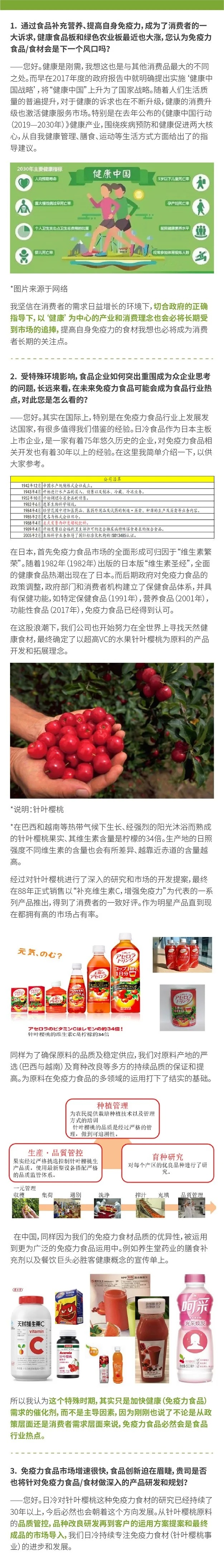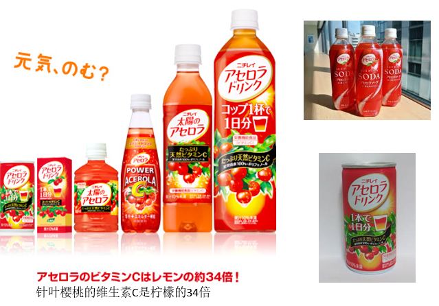 于是在这股浪潮下,日冷食品也开始努力在全世界上寻找天然健康食材,最终确定了以超高VC的水果针叶樱桃(针叶樱桃的维生素含量是柠檬的34倍)为原料的产品开发和拓展理念。