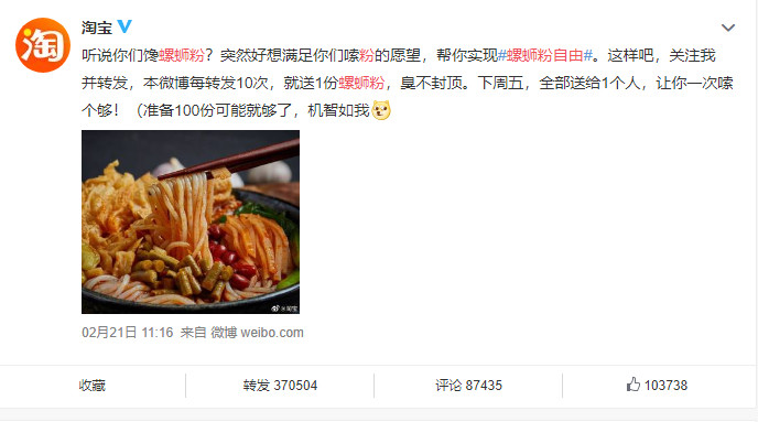 “听说你们馋螺蛳粉?突然好像满足你们嗦粉的愿望,帮你们实现#螺蛳粉自由#。这样吧,关注我并转发,本微博每转发10次,就送一份螺蛳粉,臭不封顶。”