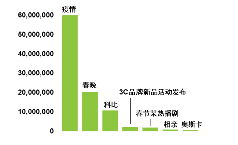 最近无论是假期传统热门话题,还是春晚、奥斯卡这样的大型文艺活动,甚至科比去世的突发新闻,在微博上的声量都远没有疫情高。2月初3C品牌新品活动发布的声量远超奥斯卡,也超过春节假期某热门话题剧,但只占疫情声量的3.5%。