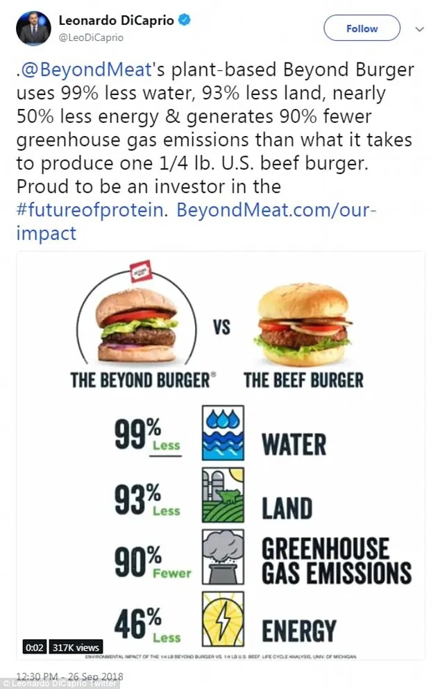这一点也确实得到了验证,一个Beyond Meat汉堡的碳排放比牛肉汉堡低90%,占用的土地资源少93%,节省99%的水资源。