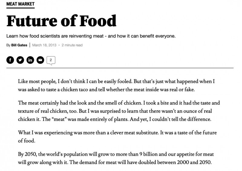 布朗拿给比尔•盖茨一个墨西哥卷饼,里面放的肉是Beyond Meat的冷冻鸡柳,盖茨在博客上写“我不会轻易被骗,当他们问我里面的鸡肉是真是假时,(我以为是真的),外观、气味、口感都跟真鸡肉一模一样。”