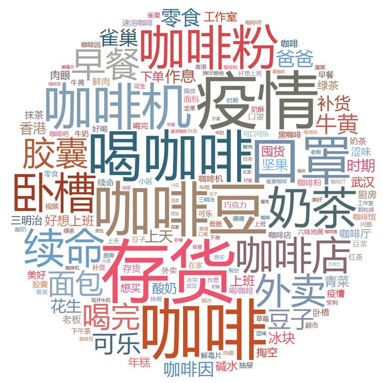 /关于咖啡存货的词云-除了核心关键词外,我们还看到了续命,好想上班,以及各类搭配服用的食物/
