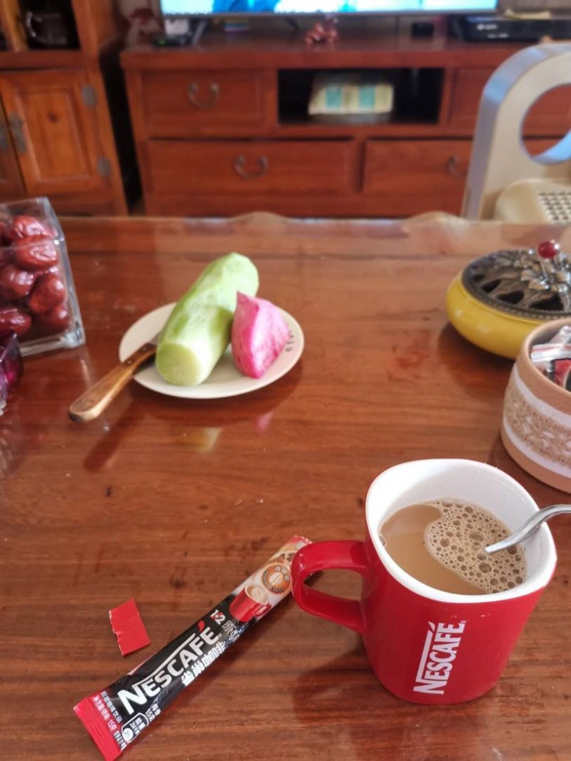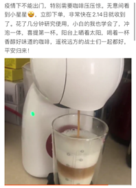“我最近把家里的速溶咖啡拿出来喝,热热的,甜甜的,特别好喝!”