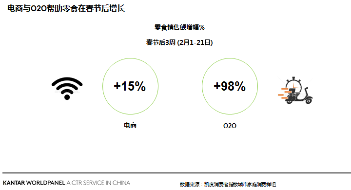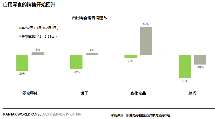 在提倡“无接触”购物的特殊时期,电商与O2O平台成为了最佳的购买途径。春节后的3周内,零食(尤其是膨化食品和饼干)在电商的销售增长了15%。