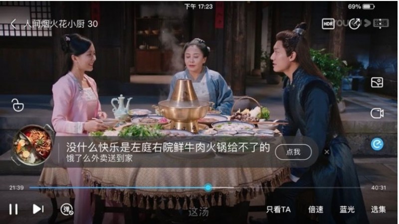 1月29日,优酷和饿了么就上线了一期“边看边吃”。优酷在疫情期间热播的分账网剧《人间烟火花小厨》中加入了中高端餐饮的内容——眉州东坡多种蔬菜组合的菜篮子以及12款经典菜半成品,观众在看美食内容种草的同时,可即时在饿了么下单外卖解馋,目前已经可以在北京、上海等8个城市全城配送。