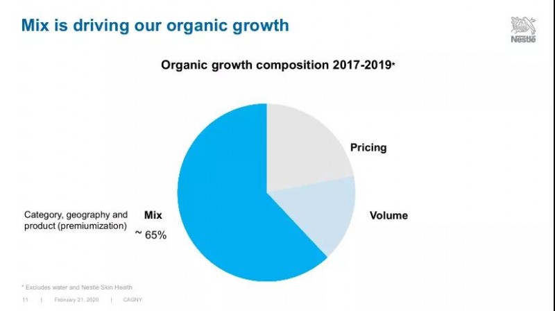 他又指出,分析表明,在过去三年中由于定价相对平稳,因此雀巢增长的三分之二是基于组合策略(包括产品类别、地理和产品等),而大部分又是来自高端化的产品组合策略。此外,过去三年销量也在逐年增长。