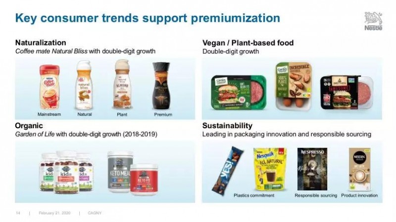 Roger还解释了雀巢对于“高端化”这个词的理解。他表示,事实上,推动高端化是基于两大趋势,其中之一是核心的消费趋势。“我们正在努力推动消费者需求。人们对天然产品有一种被压抑的需求,回归是很重要的。”