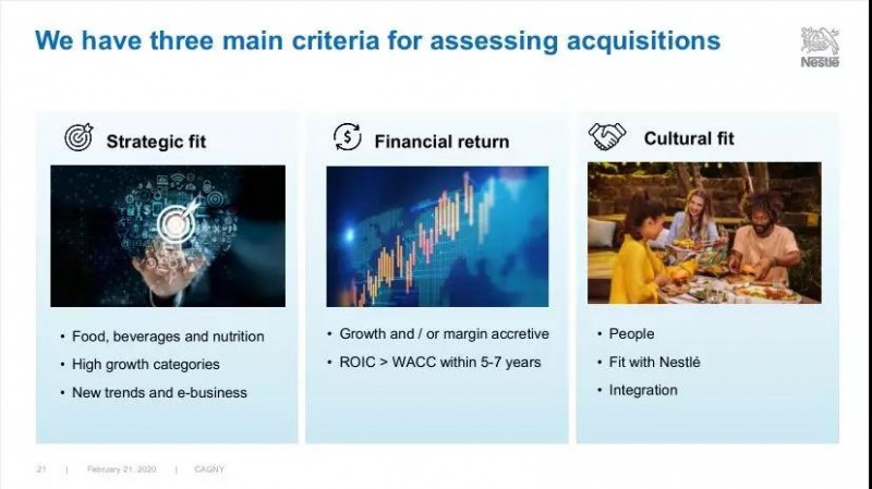 他还详细介绍了雀巢在评估收购方面有三个主要的标准,包括:战略契合度、财务收益、文化契合度。