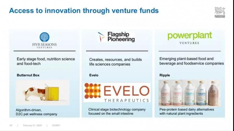 Sanjay介绍,第一笔投资落在名为Flagship的生物技术基金中,该基金正在对营养科学领域具有突破性技术的公司进行投资,与雀巢健康科学业务匹配。此外,雀巢还参与了专注于营养科学、食品和食品技术的欧洲基金Five Seasons,近期还入股了美国一个名为Powerplant ventures的基金。