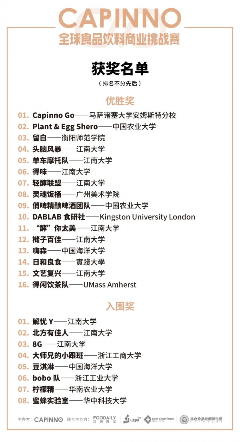 一月份,经过CAPINNO决赛激烈答辩及团队展示,来自国际食品头部品牌方、产业上游资深专家、新消费品牌创始人、投资人等多维度专业评审团的全面评判及评估,角逐结果如下: