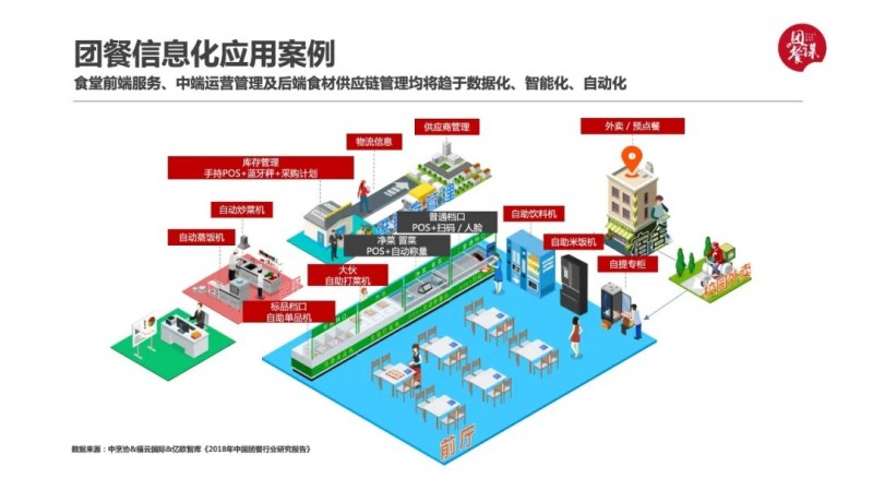 另一方面,在菜品制作以及食堂前端售卖窗口均可引进智能设备,如智能炒菜机、万能蒸烤箱、智能做饭/打饭机器人等,实现终端的标准化、智能化。