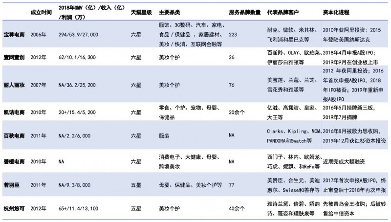 但是,这类公司的资本化路径,尤其是IPO进程却稍显坎坷。自宝尊于2015年登陆美国纳斯达克以来,丽人丽妆、若羽臣和壹网壹创等曾先后申报冲击国内A股IPO,却因为共性的业务对于电商平台的依赖、品牌客户集中度高、返利计提财务确认问题及业务核查难等问题,或被否、或终止、或中止。好在壹网壹创最终凭借扎实的业务基础,踏着美妆行业的东风,于2019年9月成功登陆创业板实现突破,并且上市以来股价不断攀升,市值已达168亿元(以2020年3月13日收盘价计算),以2019年业绩快报测算,P/E倍数高达77倍。而在壹网壹创股价高歌猛进之前,丽人丽妆、若羽臣也相继重新申报IPO。根据两家公司最新报送的招股说明书显示,丽人丽妆2018年实现收入36.15亿、净利润2.52亿。2019年上半年实现收入16.57亿、净利润1.5亿。若羽臣2018年实现收入9.31亿、净利润达7,742万,同比增幅达34%。此外,六星服务商凯诘电商曾挂牌新三板并先后多次定增融资,后于2019年7月摘牌,近期也在积极准备IPO申报。六星服务商碧橙电商近期也完成了大额融资,并将IPO申报列上了议事日程。上市公司歌力思旗下的百秋网络作为聚焦在服装行业的六星服务商,于2019年12月获得红杉资本等基金投资,大概率也会走上独立IPO的道路。而五星服务商杭州悠可则先被上市公司青岛金王收购,后被中信资本收购。