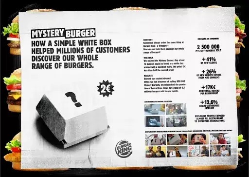小朋友你是否有很多问号?这则荒诞又可爱的广告原来是为了推广汉堡王新推出的一款“神秘汉堡“。可其实它并不仅仅是某一款汉堡。这款神秘汉堡的包装是纯白色的且带有问号。只需要2欧元,消费者就可以得到10款汉堡中的一款。