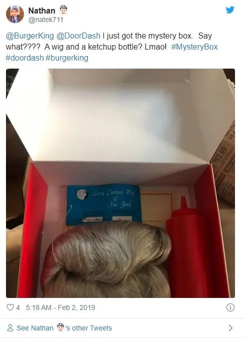 惊喜盒子里有一顶假发,一个番茄酱瓶,汉堡王复古袋子,还有一张汉堡兑换券。