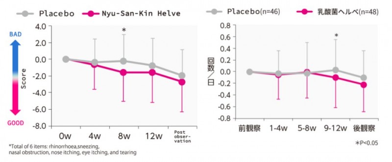 Functional Foods in Health & Disease发表的一项研究评估了人们摄入含LH2171的乳酸菌饮料对螨虫和屋尘等过敏原引起过敏症状的影响。在这项随机,双盲,安慰剂对照研究中,研究人员将招募的96名易过敏人群(对室内灰尘或螨虫的抗原特异性抗体呈阳性反应)随机分为两组,实验组饮用含有SBT2171的饮品(LH2171组,n = 48);对照组则饮用同等剂量的安慰剂(P组,n = 46),实验为期12周,过程中记录LH2171的干预对受试者眼鼻症状的变化。