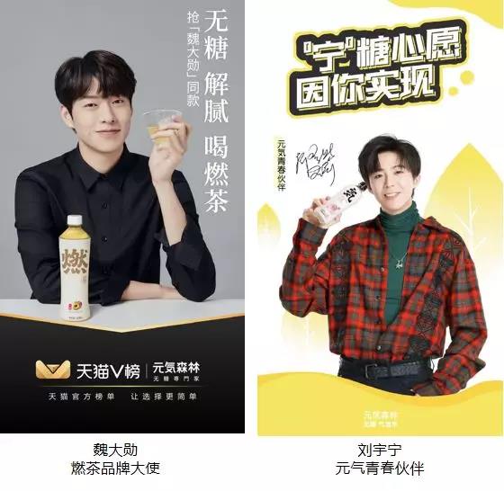 19年,元气森林更是签下魏大勋作为燃茶品牌大使,小鲜肉刘宇宁手持苏打气泡水成为了品牌元气青春伙伴,利用粉丝效应持续破圈,开启另一爆品的打造。