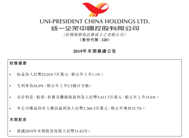 等了一天,统一终于公布了2019年年报,食品板第一时间整理出干货数据,以飨读者。