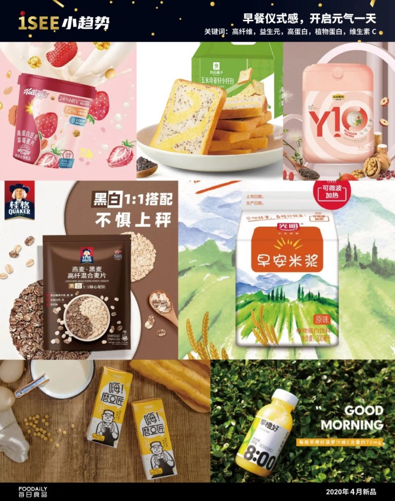 百事桂格针对“小资爱美运动一族”,以高纤维低脂肪为主打,推出高纤燕麦与低脂黑麦的黑白组合早餐谷物搭配。而家乐氏推出的新品麦片,则以高蛋白为主打,由草莓水果麦片和高蛋白豆浆粉组成,富含多种必须氨基酸和营养元素,杯装麦片也更符合方便快捷的调性。天然粉粉品牌五谷磨坊在4月推出的早餐谷物冲调制品,则更多的是强调早餐的均衡营养,由多种食材构成,高蛋白、高纤维、高钙。