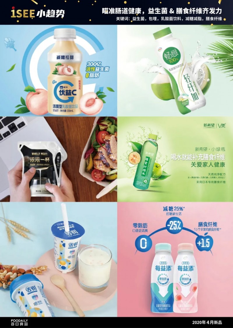 主打植物纤维力的新生代品牌Wholly Moly!在4月推出一款燕麦麸皮谷物饮料,燕麦麸皮富含丰富的β-葡聚糖,可助力清除肠道垃圾,减少肠道负担。伊利在旗下常温乳酸菌领导品牌畅意100%推出的新品"轻纤加",也是添加约等于1.5个椰子的膳食纤维,主打轻体纤体更畅体。