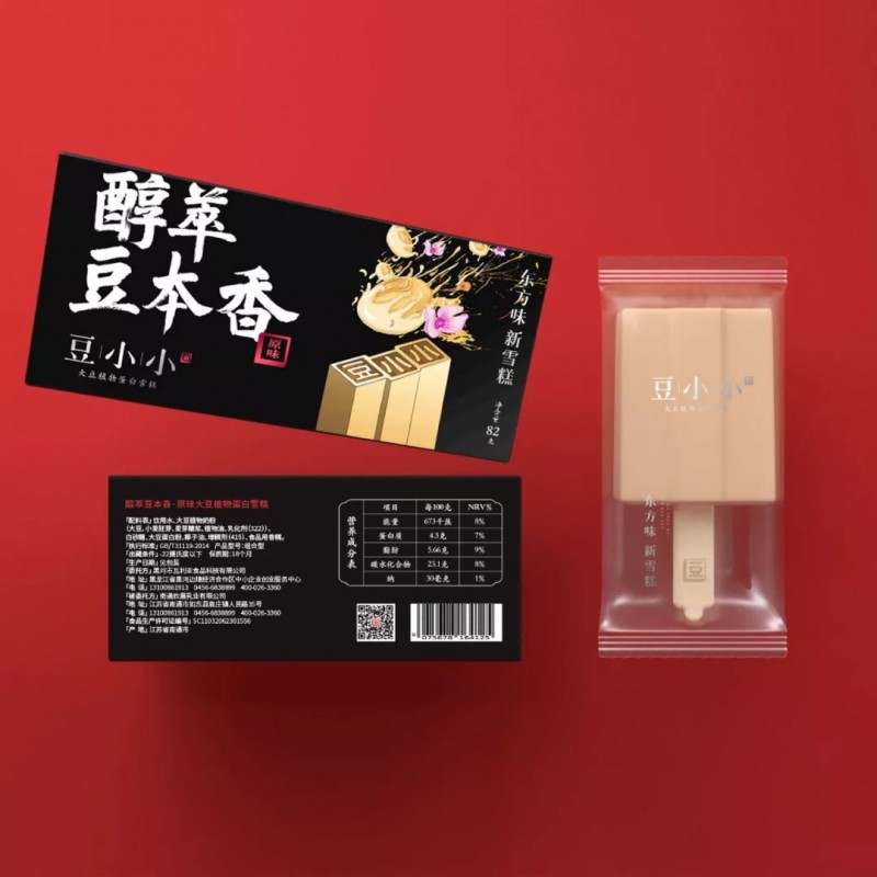 作为中国创新品牌豆小小,在包装和产品形态上以中国风为主。形态上,将豆小小三个字雕刻到雪糕上,以活字印刷的样式加深消费者对品牌的认知度。