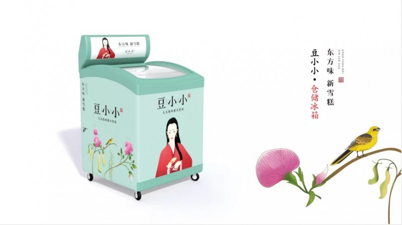 在包装袋上,豆小小采用保温袋,墨绿色的复古包装袋,让人眼前一亮。在终端冰柜上,豆小小依旧以中国风主题为主,成为终端最亮眼的风景。