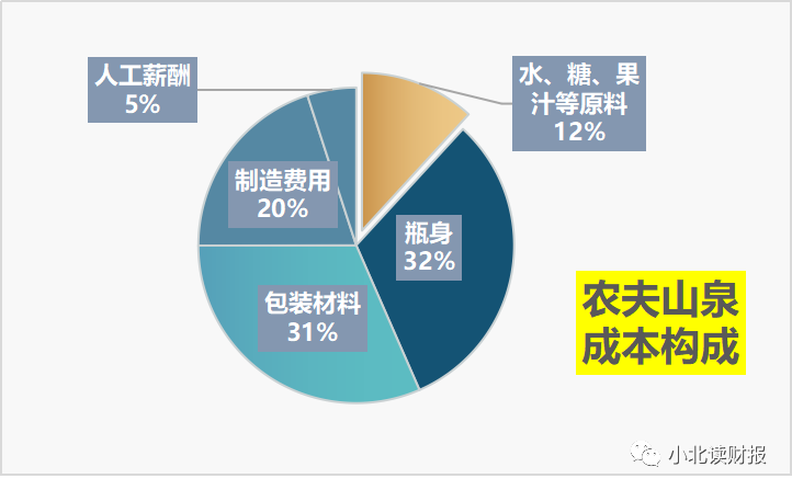 看了农夫山泉的招股书,你会大吃一惊,一瓶水的毛利率就有55%。再从成本构成看,假设你花三块钱买了瓶农夫山泉的饮料,你要为它的成本付费1.35元,其中包括:为瓶身付费0.43元,为包装材料付费0.42元,喝到你嘴里的只占总成本的12%,只值0.16元。