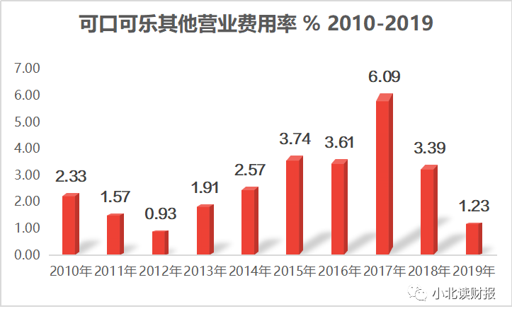 2017年后,农夫山泉的行政开支一路上涨,在2019年达到了5.76%;同时,可乐的其他营业费用率一路下降,2019年只有1.23%。