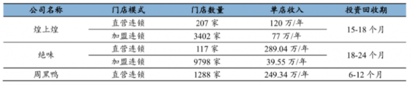 在国泰君安证券2019年对中国卤制品行业调查的一份研报中,我们可以看到,相比同类型的绝味及煌上煌,周黑鸭门店拥有较高的收入,回报周期也更短。