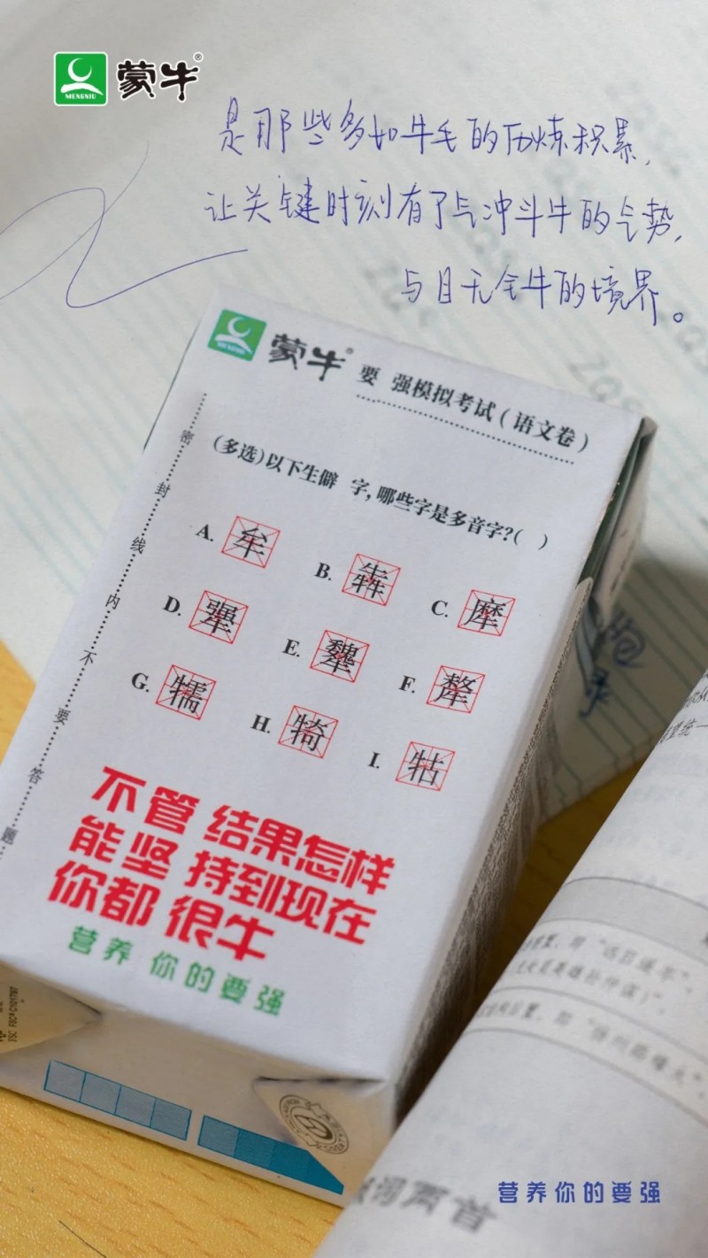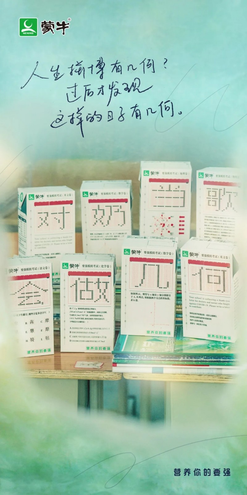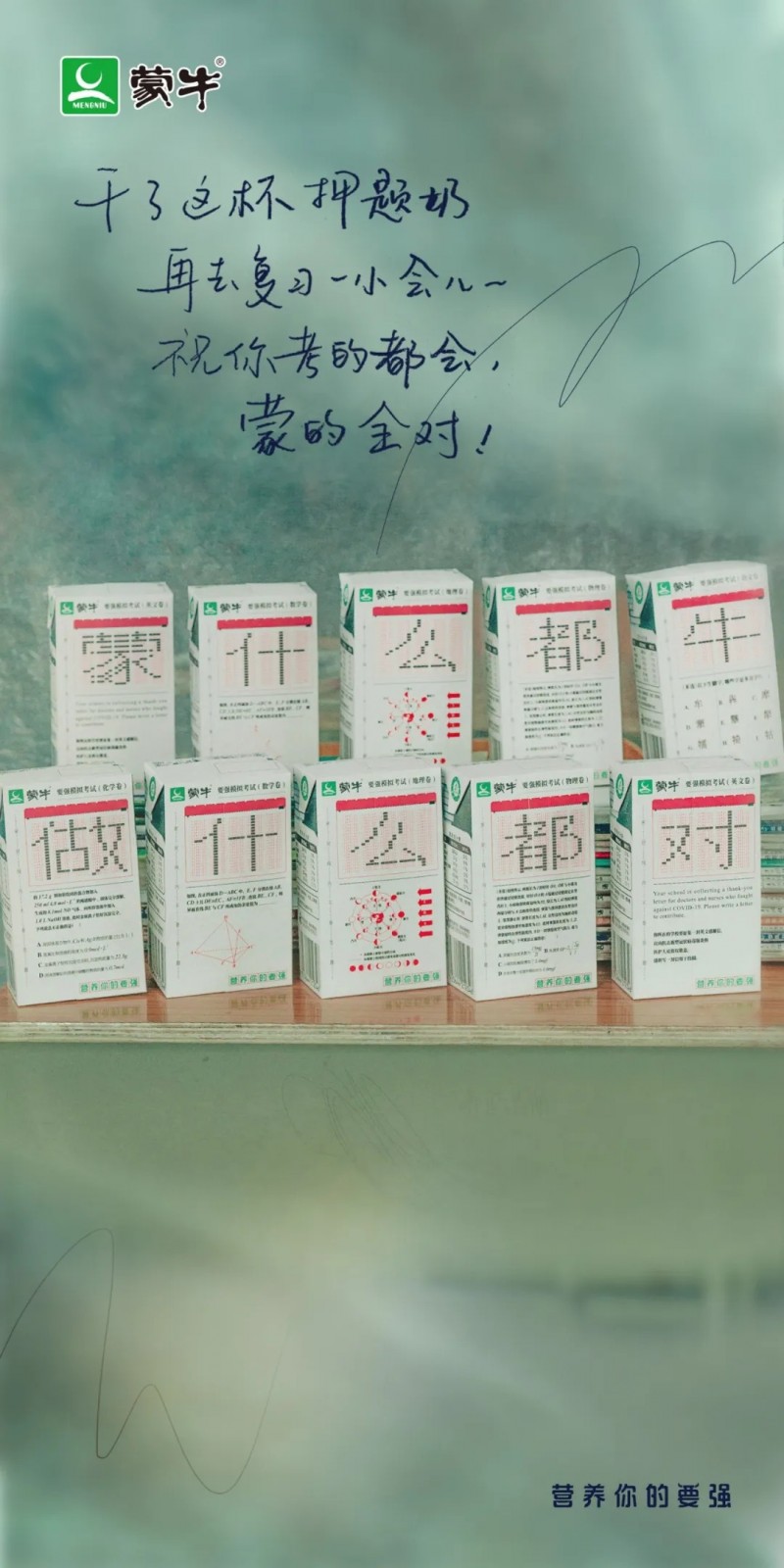 在这样的大背景下,蒙牛为了给高考学子们加油打气,推出了一套既特别又有点新意思的产品。