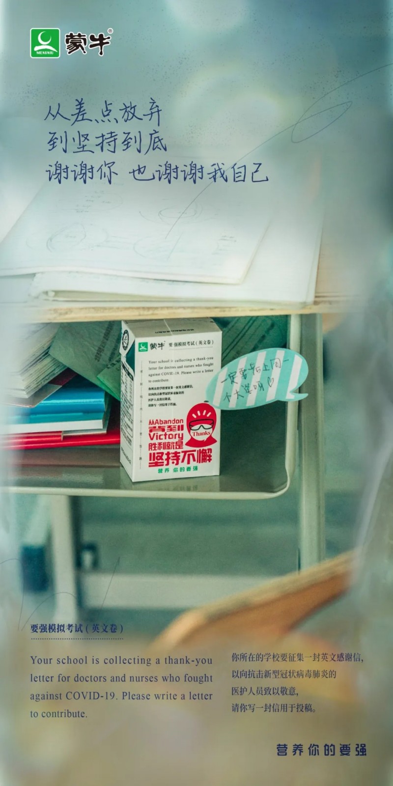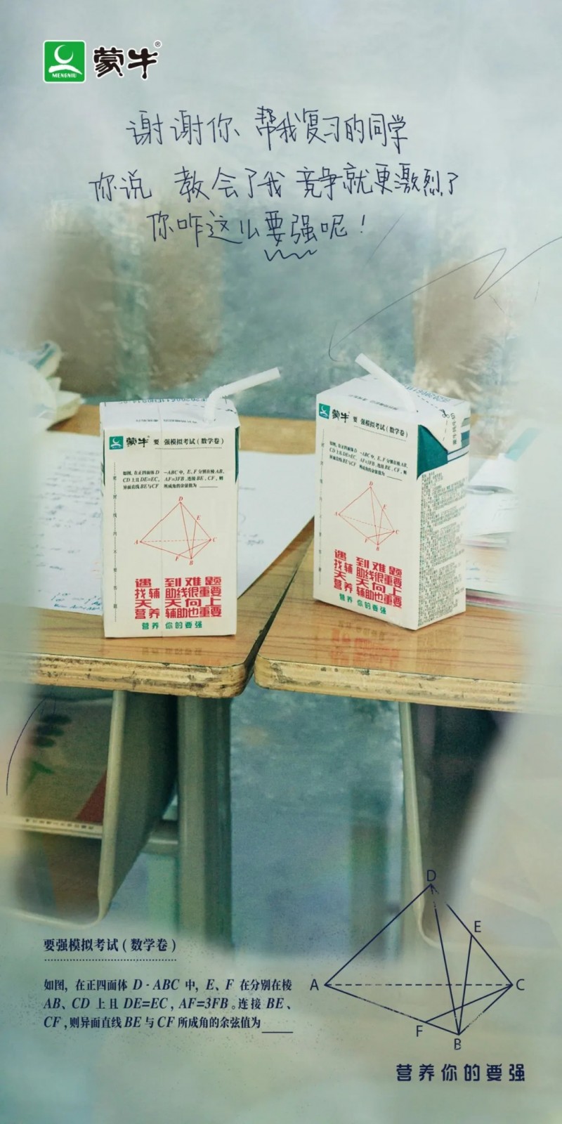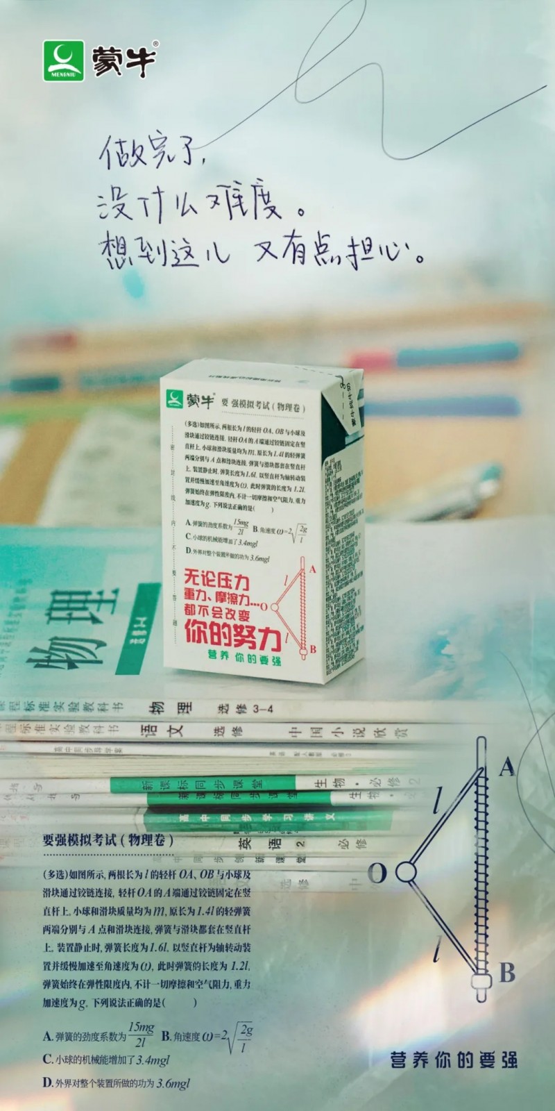 在这样的大背景下,蒙牛为了给高考学子们加油打气,推出了一套既特别又有点新意思的产品。
