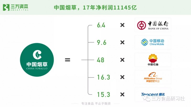 中国最大的食品公司是谁?中国烟草,17年净利润11145亿,上缴财政过万亿,万亿是个什么概念,2017年中国财政总收入也才17万亿,中国其他食品企业的利润总和也不过如此吧。中国烟草是没上市的,上市的食品企业头牌是谁,贵州茅台,同时也是A股一哥,1.8万亿市值啦,是不是也有上瘾性?