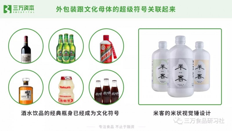华与华经常讲的超级符号就是超级创意,特别值得参考,食品如果跟文化母体中的超级符号关联起来,就能拥有超越周期的强大生命力,三万资本的另外一个食品项目米客米酒也在摸索自己的超级符号。