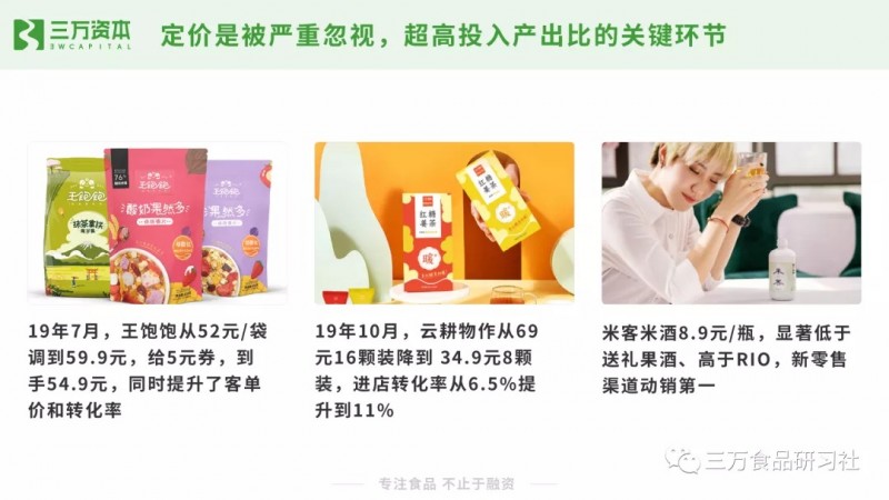什么叫一个好的食品定价?除去少数带有彰显价值的类奢侈品食品品类,比如高端酒、燕窝、烟,这些可能价格越贵越好卖,大多数食品定价要“让用户觉得值”很重要。王饱饱在19年7月把价格从52元/袋调到59.9,给5元代金券,转化率提升30%,云耕物作19年10月把69元的16颗装变成34.9元的8颗装,进店转化率从6.5%提升到11%。这两次调价其实都是变相涨价,但转化率和客单价都提升了,因为用户觉得更便宜了。