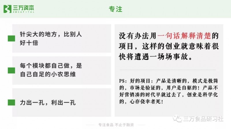 食品创业有方法论可循嘛?坦率地讲,没有!方法论是成功企业用归纳法总结出来的,但创业是演绎法。尤其是在黑天鹅遍地的今天,如果硬要刻舟求剑,那就是自缚手脚,三万资本的每一个项目都和第一天的样子有着千差万别,Luckin Coffee 600天上市的计划型创业不可复制,而且想到了开头,也没想到结尾啊。