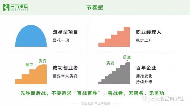企业家精神是每个企业最大的资产,战争以一方失去战斗意志为结束,食品是个慢行业,不可能永远一帆风顺,留在战场上,就有机会翻盘