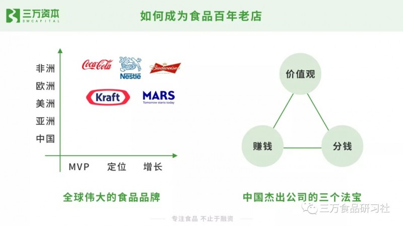 为了搞明白什么叫基业长青,我们可以看看基业长青的食品企业都长啥样,雀巢、卡夫、百威、玛氏,无一不既是时间的朋友:核心品类长期贡献利润(用李嘉诚的话讲,天塌下来了,还有一个是赚钱的);也是空间的朋友:卖完美洲卖欧洲,卖完欧洲卖亚洲。简单点讲,就是卖给所有人,长时间在卖。