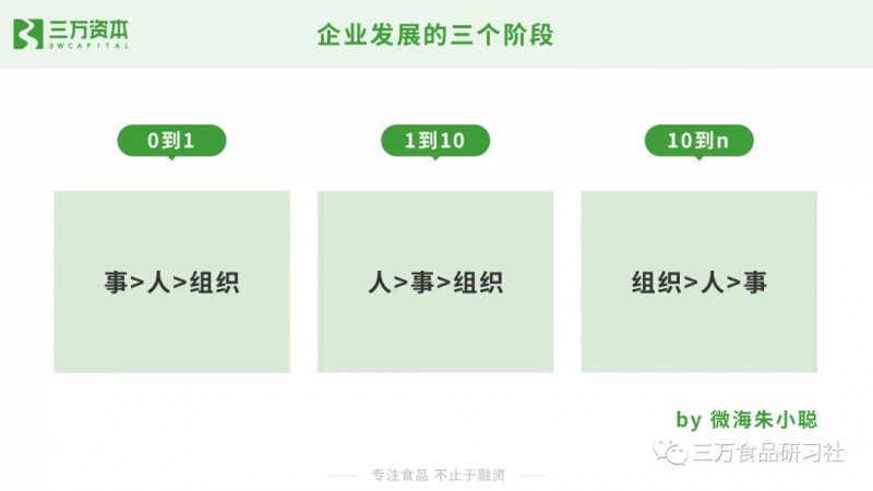 海底捞旗下人力资源服务公司微海CEO朱小聪在三万食品研习社做过一次组织力分享,提到了事、人和组织的三个阶段,我深以为然: